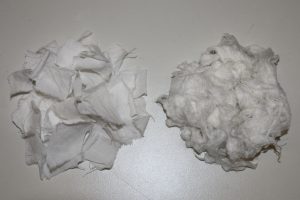 - On the left, textile waste that comes in to ShareTex, on the right, recycled cellulose pulp. Photo: Sharetex